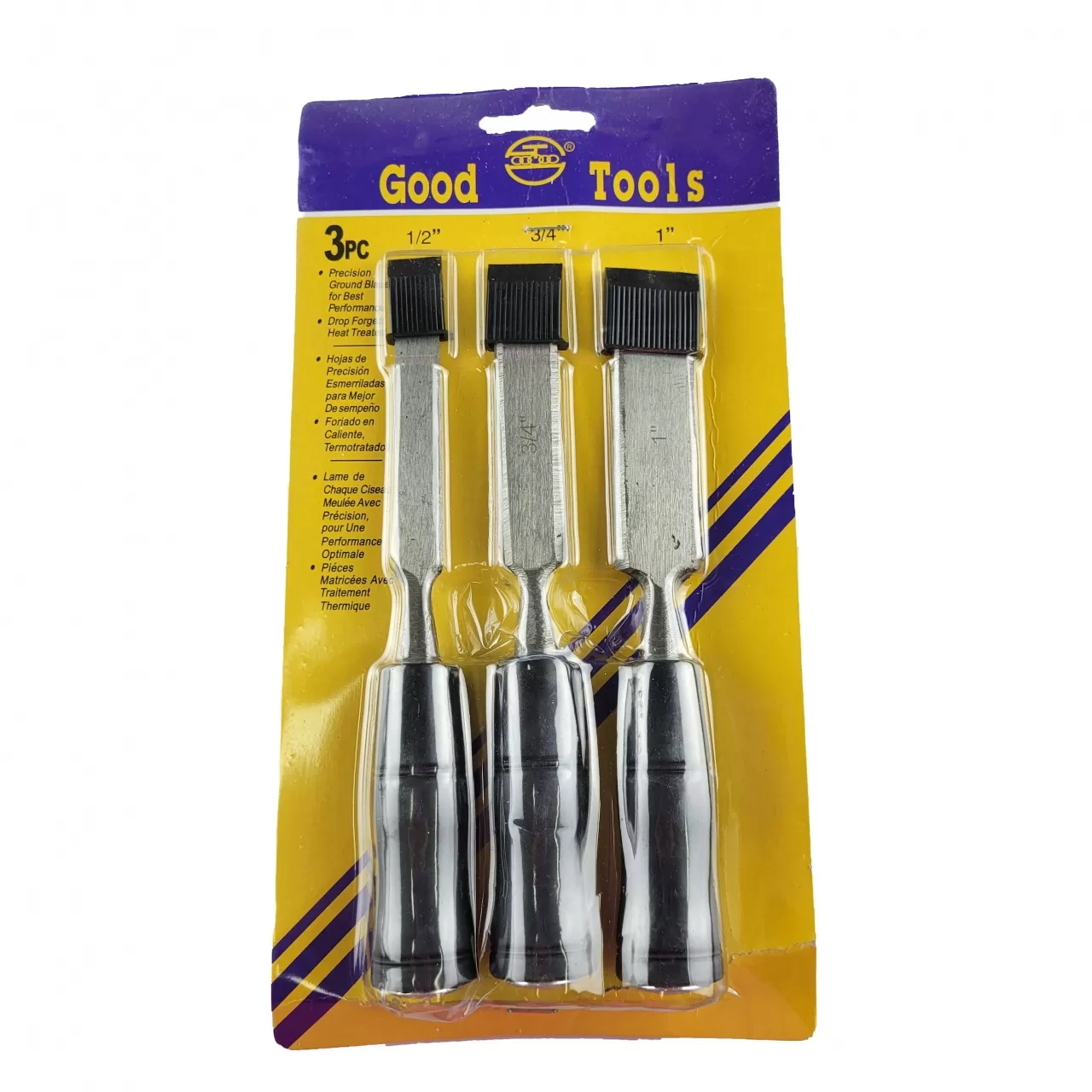 В комплект входят три стамески по дереву шириной 12, 18 и 25 мм.